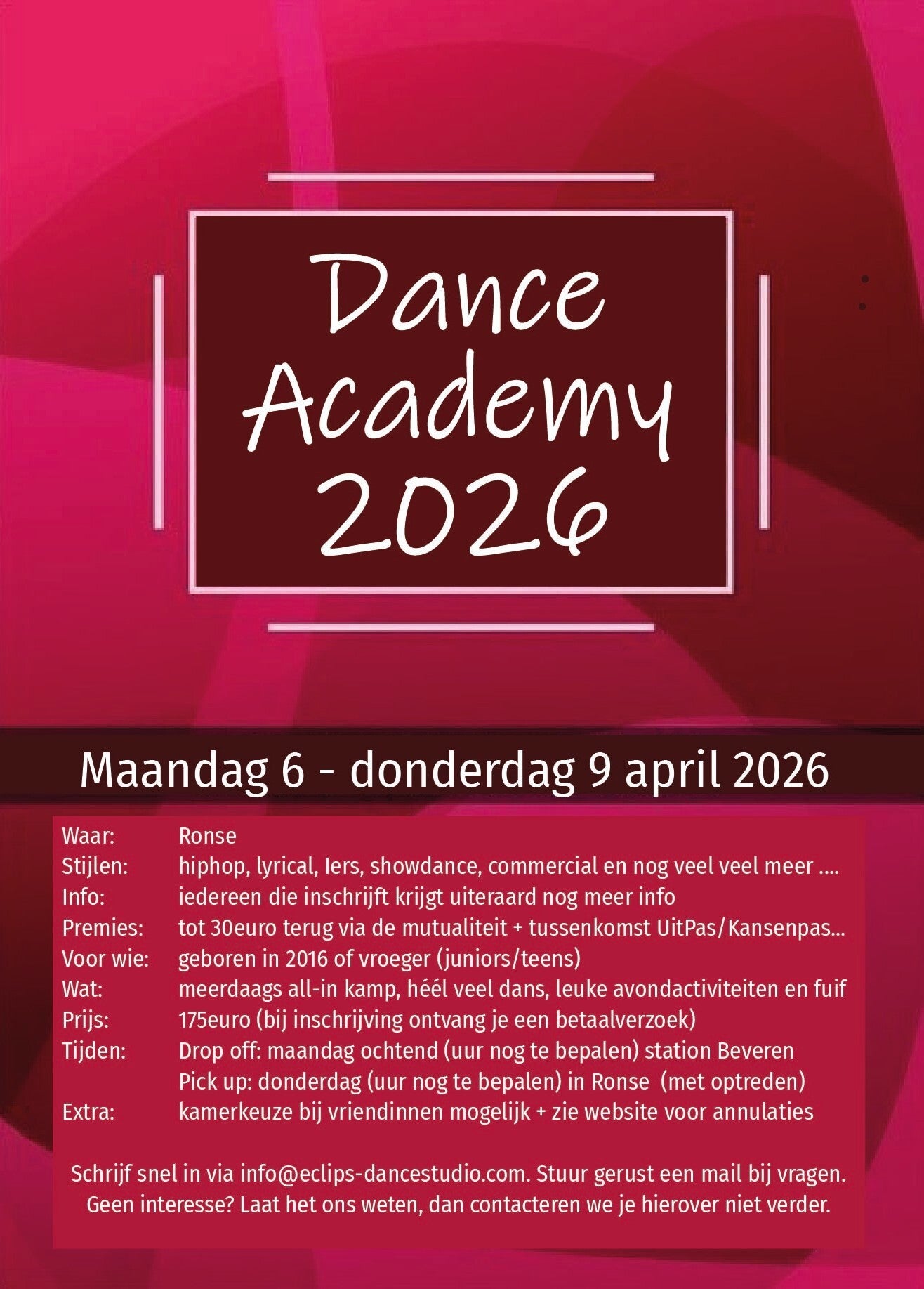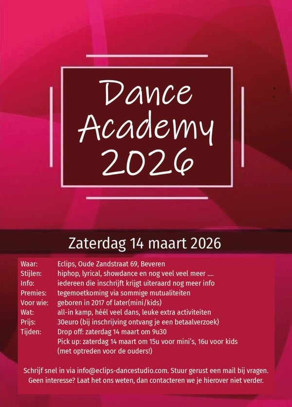 Wil je ondergedompeld worden in een bad vol dans? Maar ook leuke spelletjes en heel veel fun meemaken? Schrijf dan snel in, je ontvangt een bevestingsmail met betaalverzoek. (Mini-Kids €30 14 maart - Juniors-Teens €175 6-9 april)